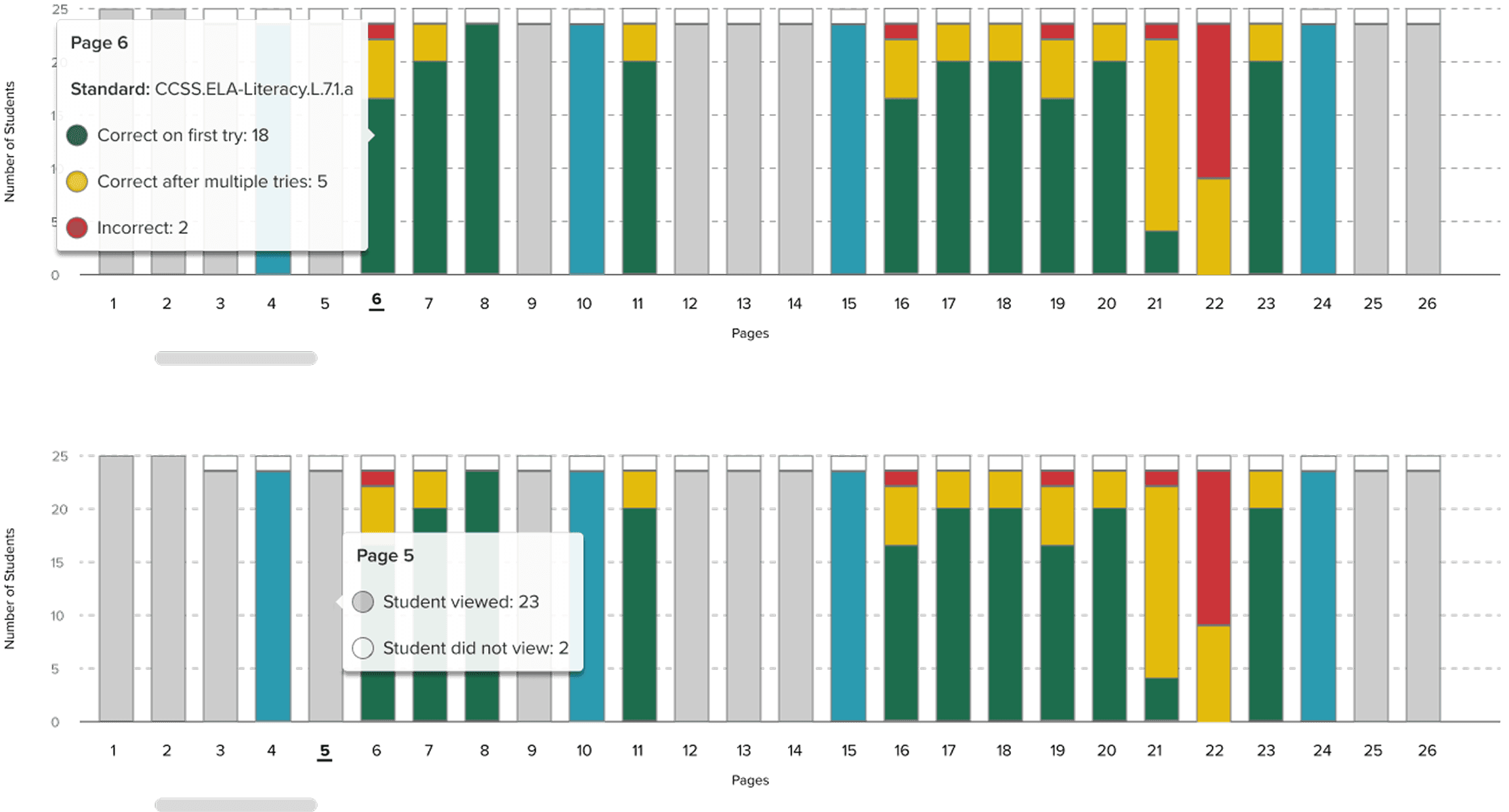When the teacher hovers over any of the bars in the page performance graph, a tooltip appears to give them more information about the page, as well as student data and any standards that are associated with the page content.