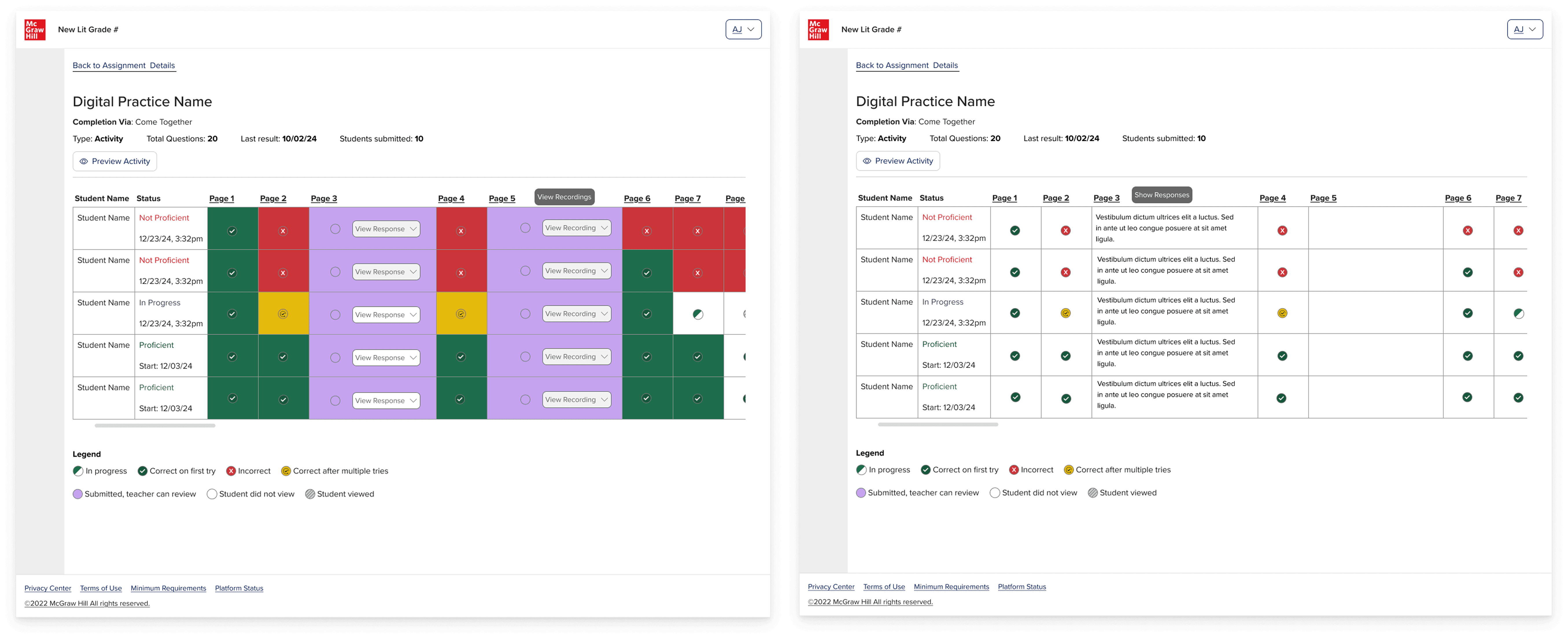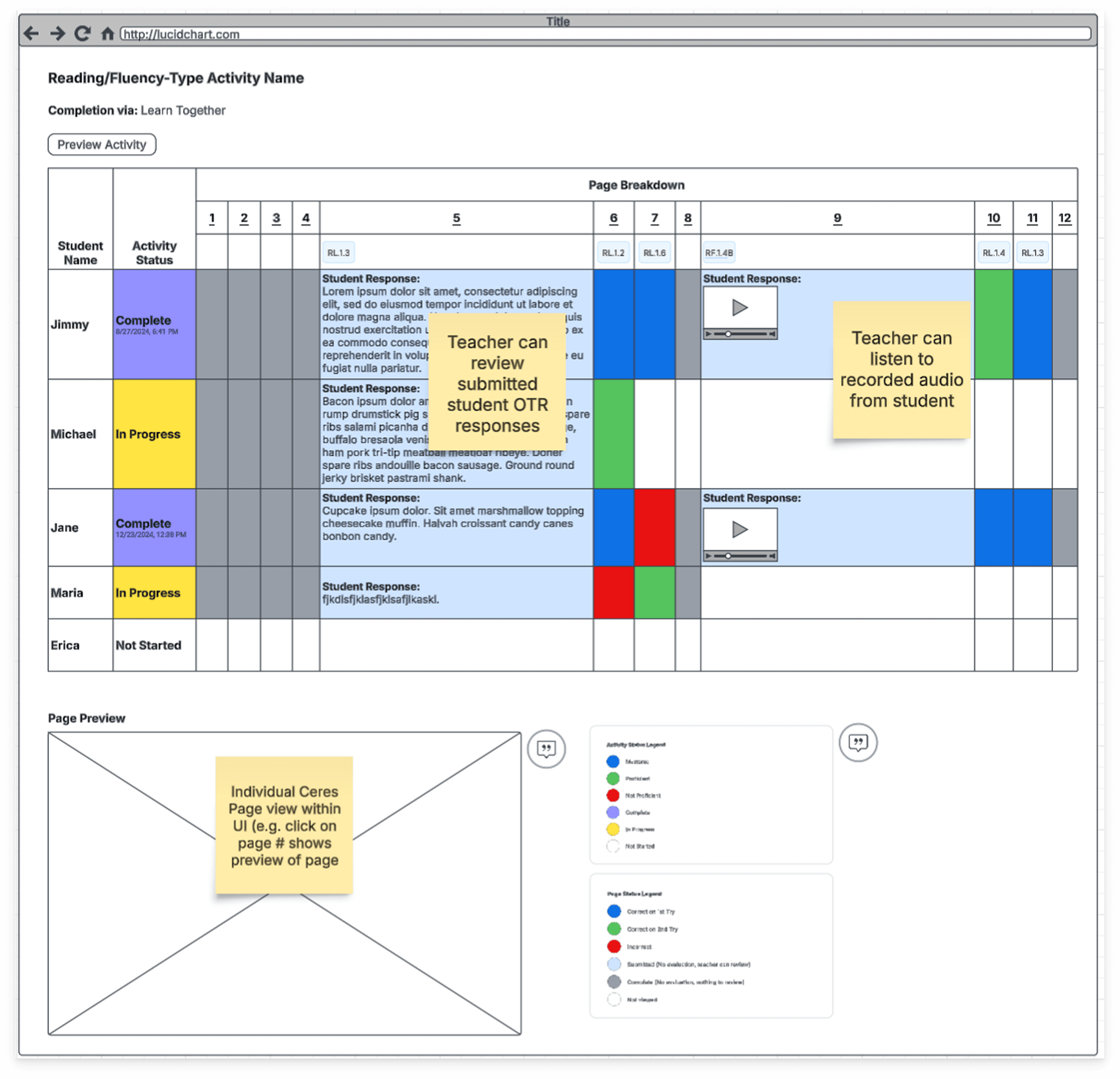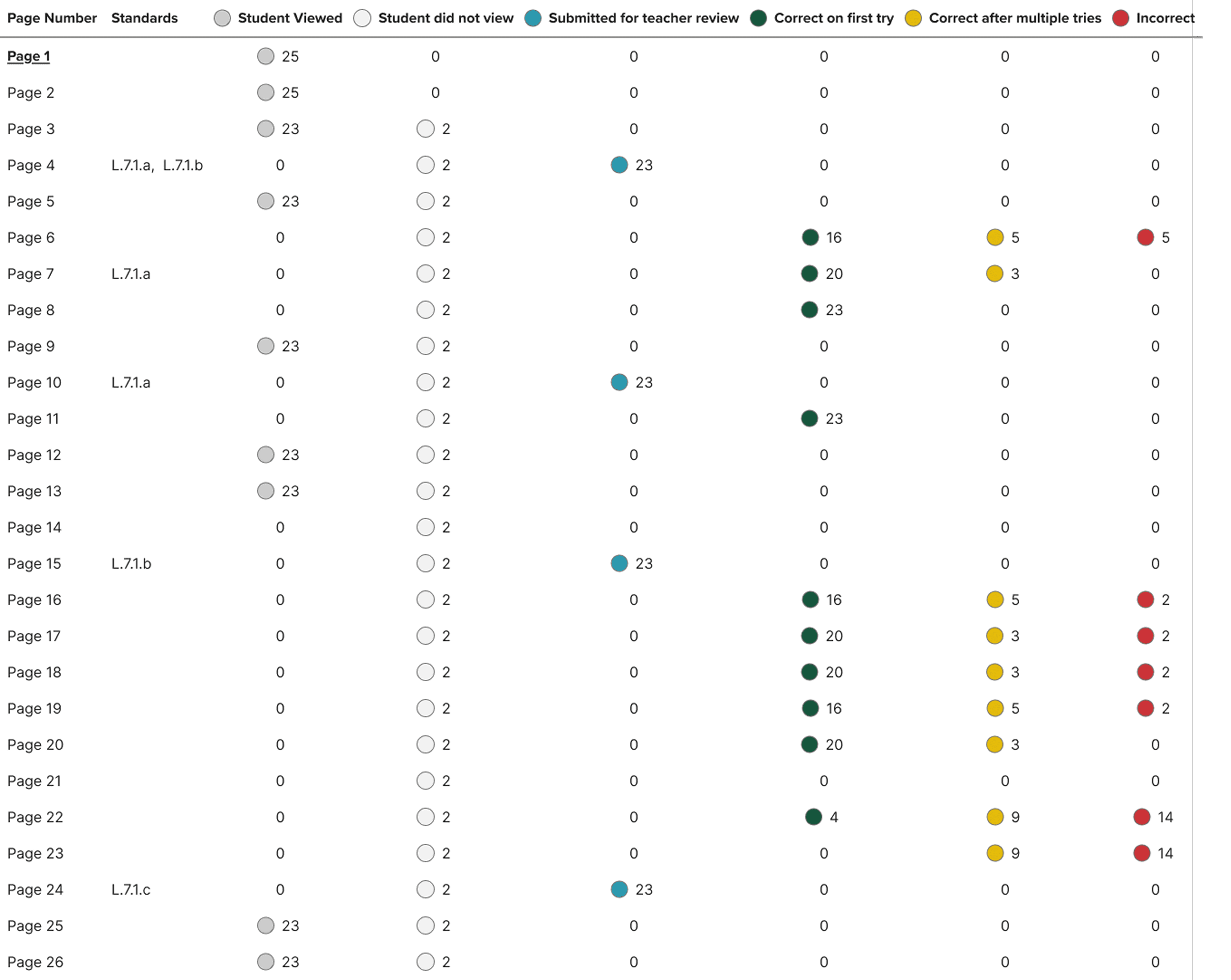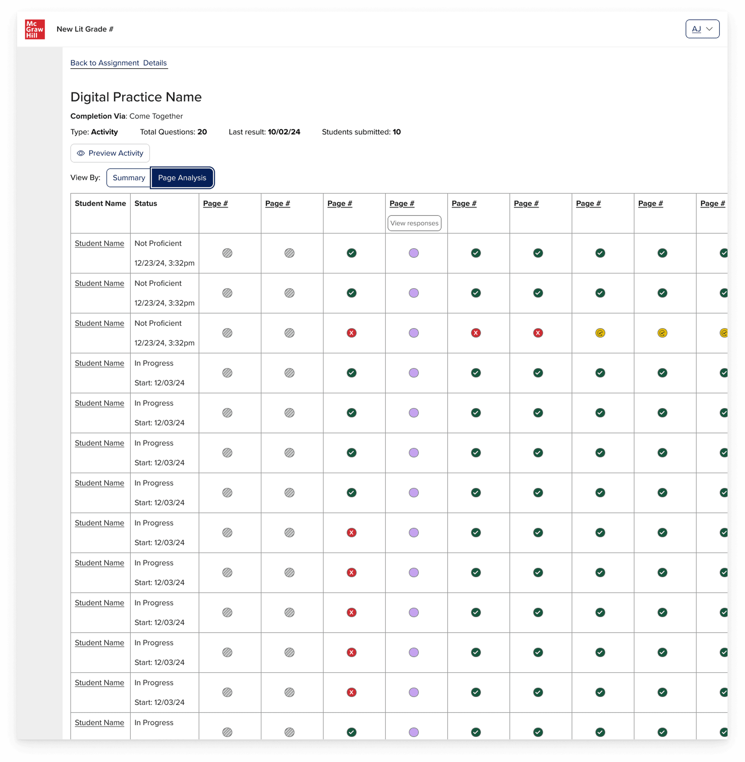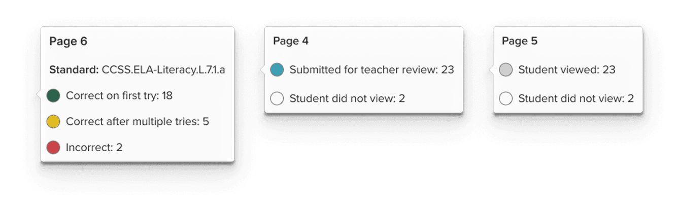 But statuses alone weren't enough. The existing system summarized data at the activity level. For a literacy teacher, that's too coarse. A single activity might span fifteen pages, some instructional, some with auto-graded questions, some with recordings, some with open text.