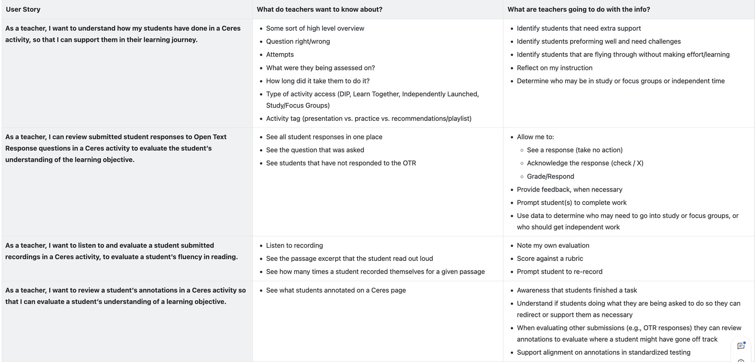 The teacher advisory board, a group of active classroom teachers who met monthly with the product team, responded directly to the product team. Their feedback was unambiguous: this was information they had been wanting. The ability to see page-level progression, access student recordings and open-ended responses without leaving the reports context, and identify students in a "needs review" queue without manually chasing submissions named specific pain points they'd been working around for years.