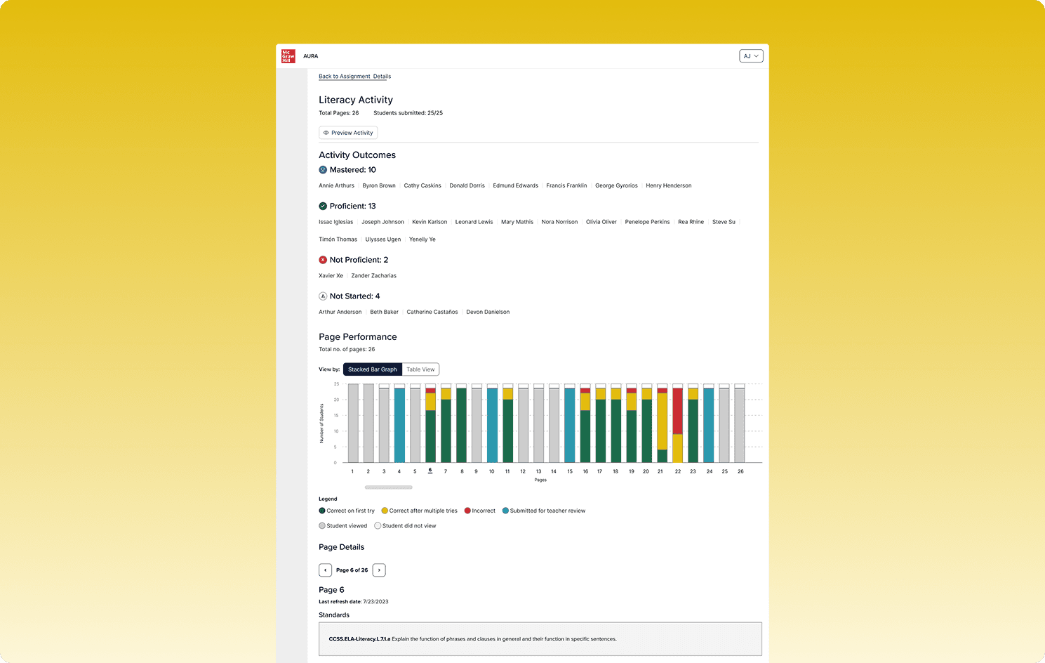 Clicking any bar or table row opens a page-detail panel without navigating away from the overview. The panel surfaces: standards alignment for that page, a live preview of the activity page itself (resolving the teacher's need to understand context without emulating a student), and a sortable grid of individual student results.