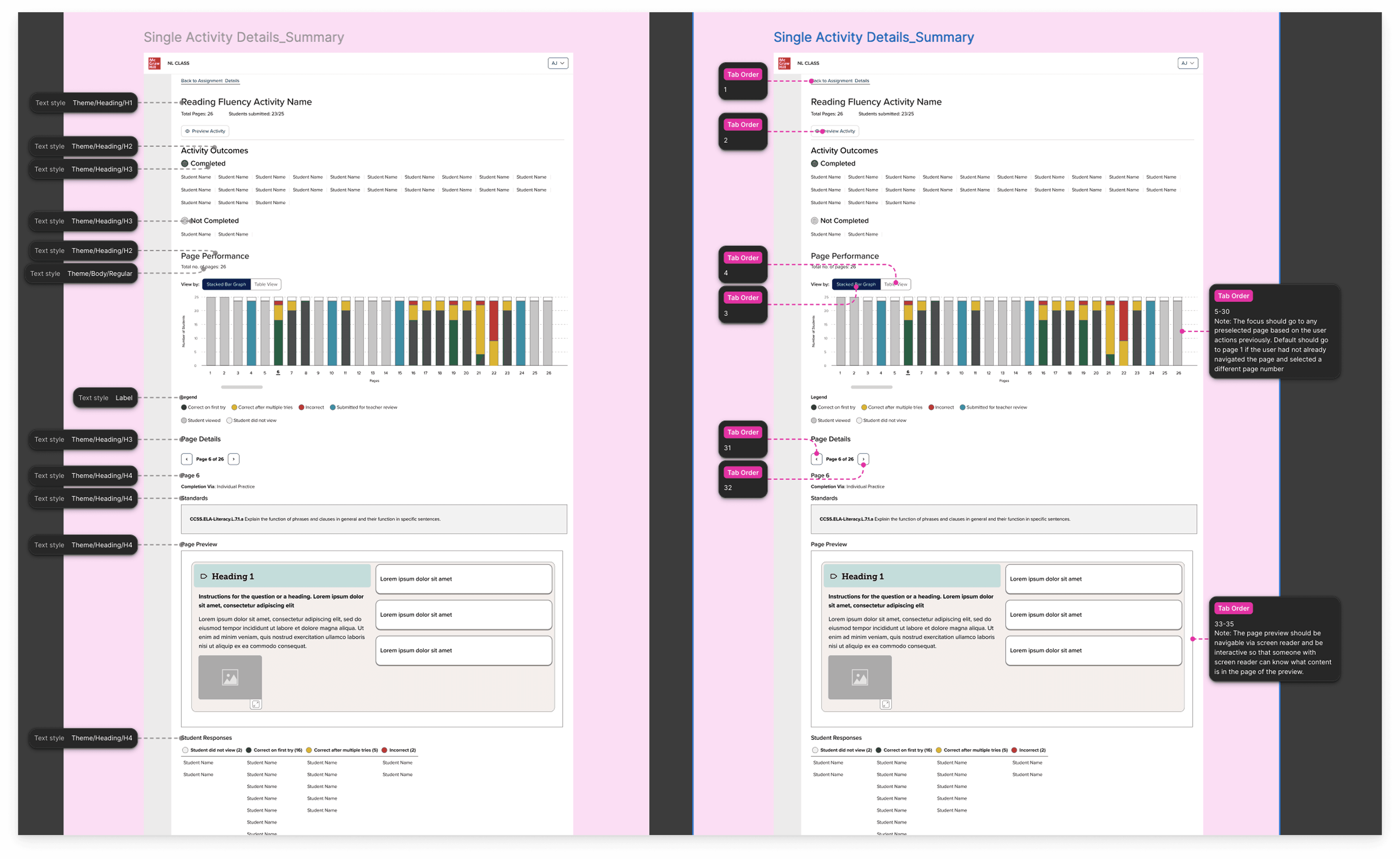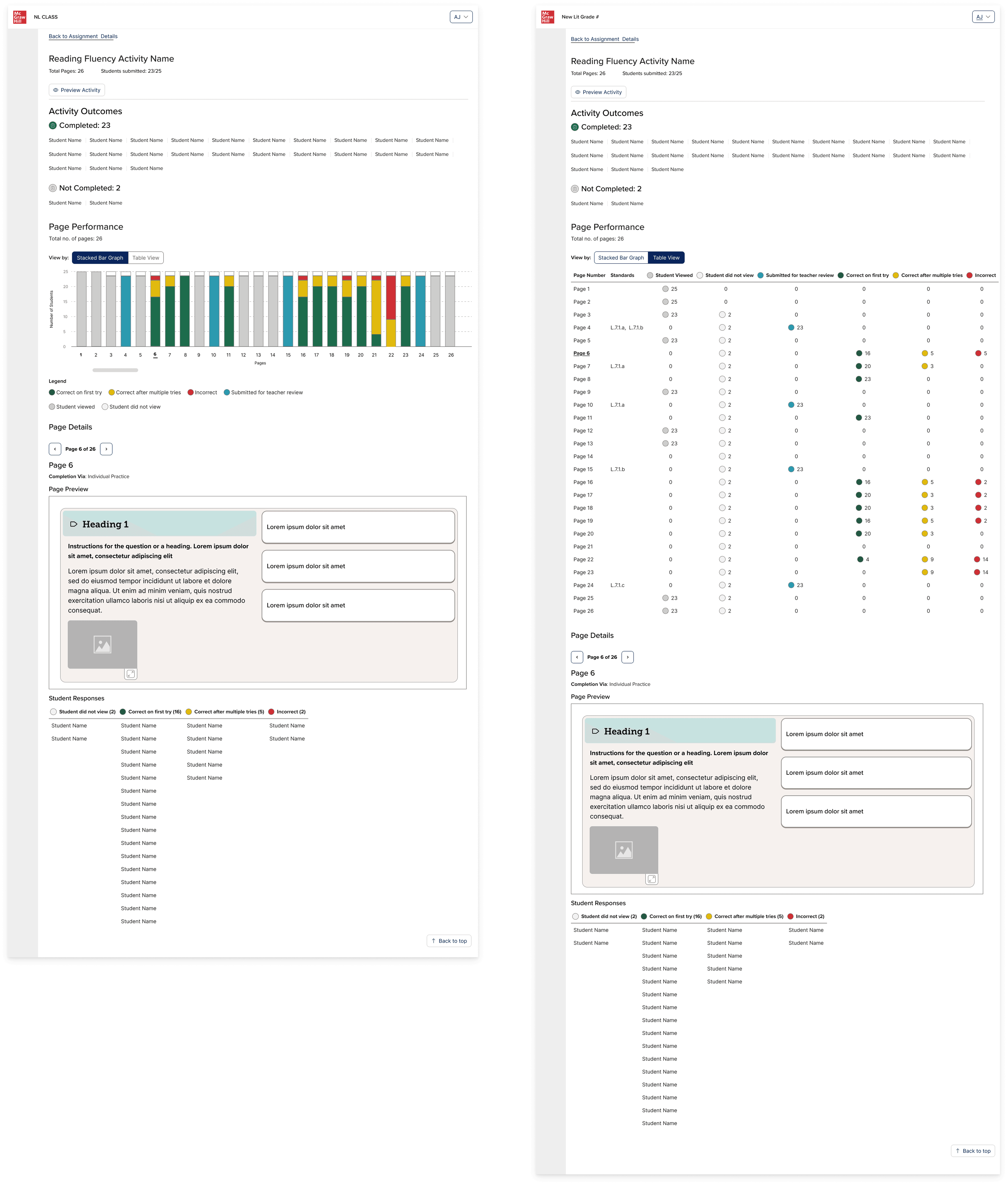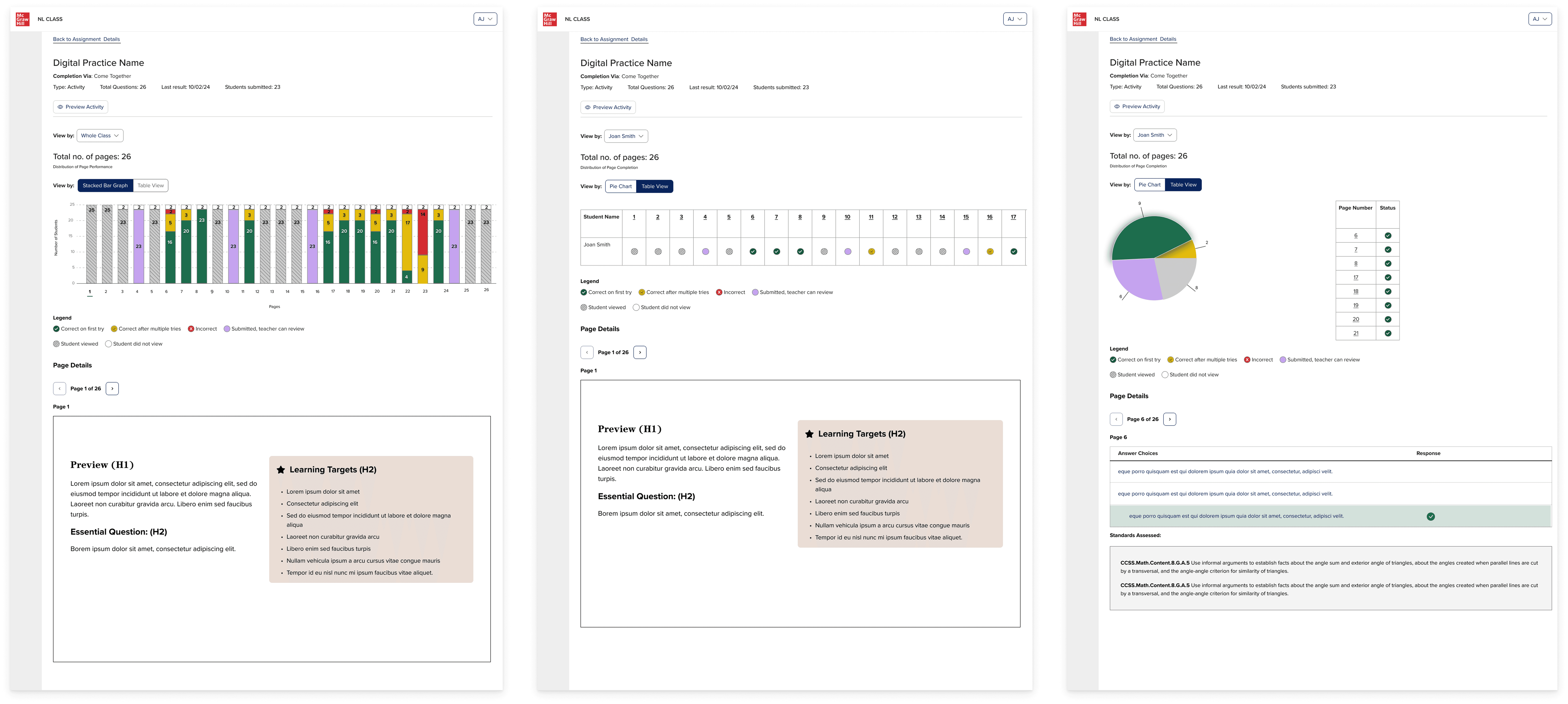 After several rounds of iterations, I advocated for the bar graph solution as teachers would be able to see the whole activity holistically as well as having the ability to drill into the activity page specifically to review student responses. If the bar was gray, then they knew that the page was just something the student had to read. If the bar was purple, then they needed to manually review the student work because it was some type of non-binary response. And then if the bar was red, green, yellow, then they could comprehensively see the class performance breakdown by clicking on that question number or bar, and they would see the content below shift to reveal that activity page content and students' responses.