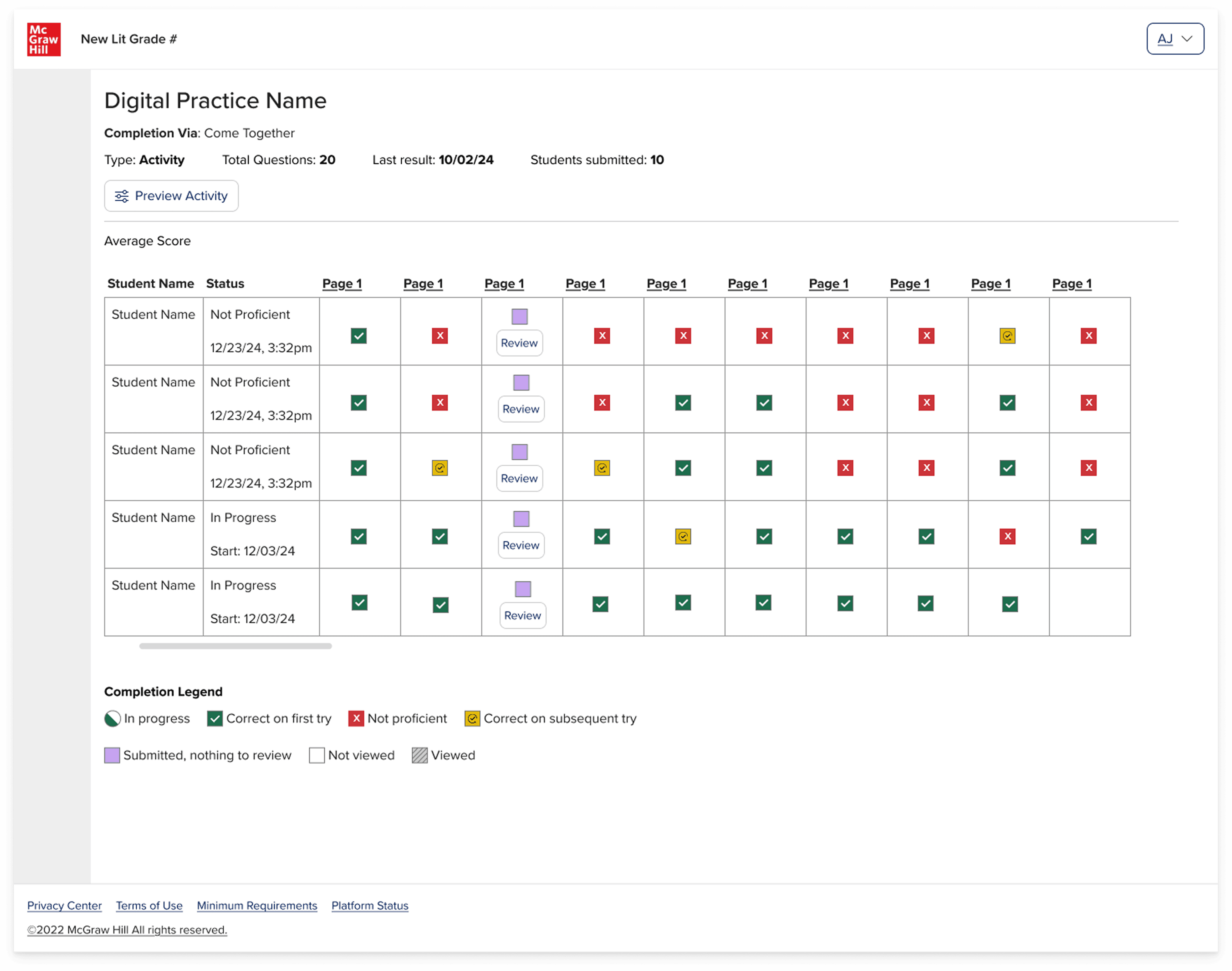 Teachers need a fast, reliable way to see how each student is progressing through digital activities. The current platform offers only raw completion data with no way for the teacher to view student data for each activity page including student outcomes, if the student viewed or did not view the page, and any open-ended submissions. Additionally, the teacher cannot preview the activity without emulating a student.