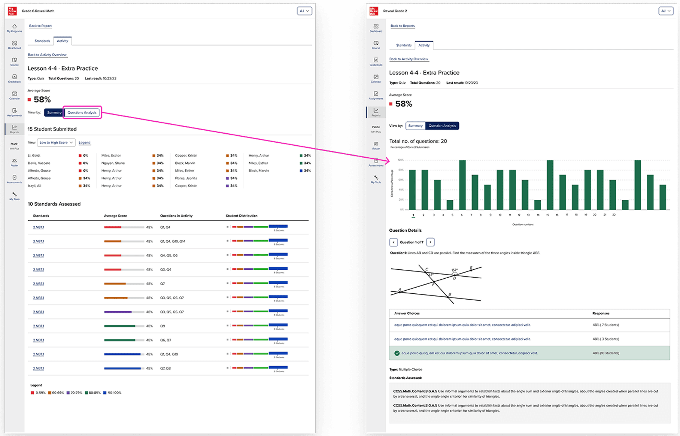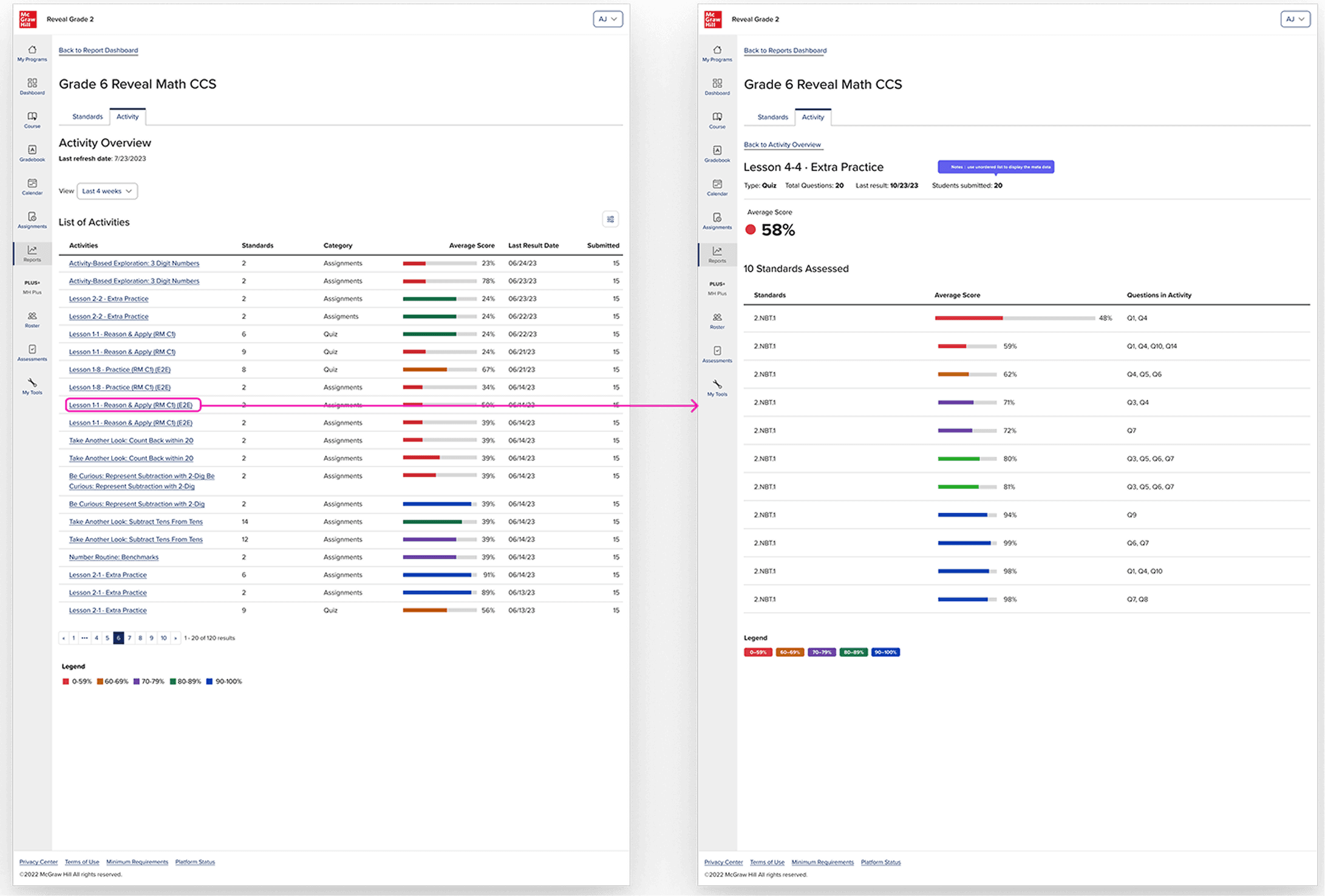 The existing system was well-designed for what math reports need: a ranked list of activities, each with an average score represented as a percentage, color-coded by performance band, with the ability to filter by standard or category and drill into per-standard breakdowns. For math, this works. Performance on a quiz question is reducible to correct or incorrect. A percentage is a meaningful summary.