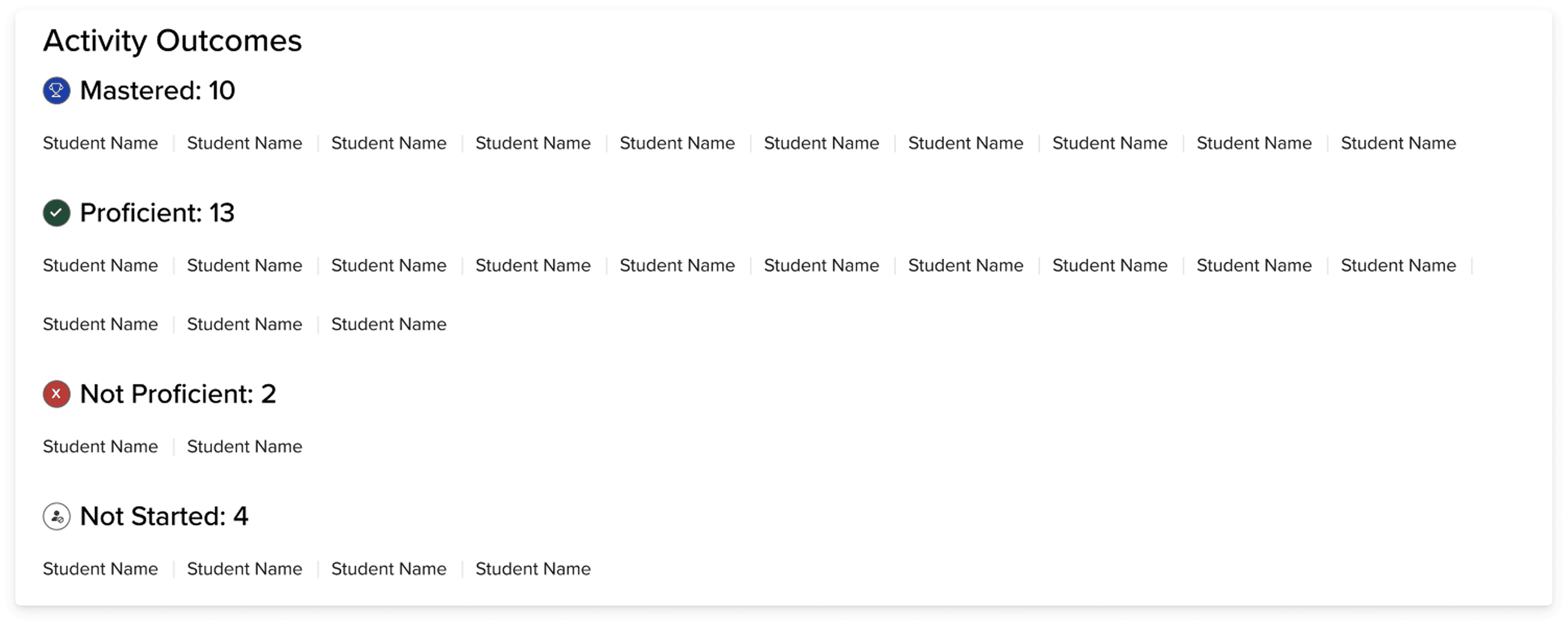 A section at the top called "activity outcomes" groups students depending on their proficiency or whether they had completed the activity or not. If the activity page has responses that the teacher must review or there is no student response, then there are just: completed and not started. However for the activities that are system-reviewed, the following outcomes are shown: