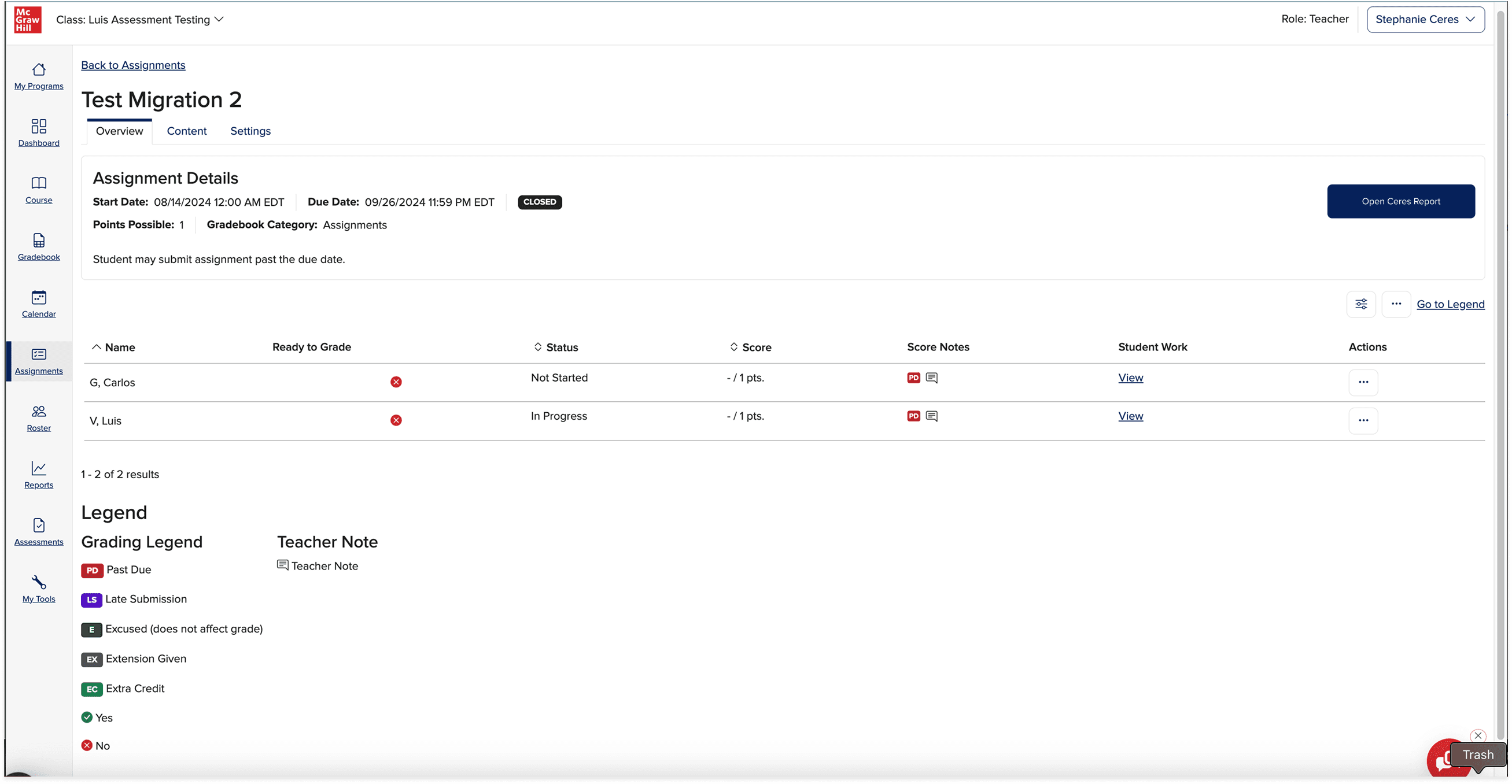 There was also this existing assignments report that was used to track if students had completed the assignments as well as a place for teachers to input scores. This felt like a relevant experience to review internally beforehand as well as it required teacher intervention more than the other reports I took a look at.